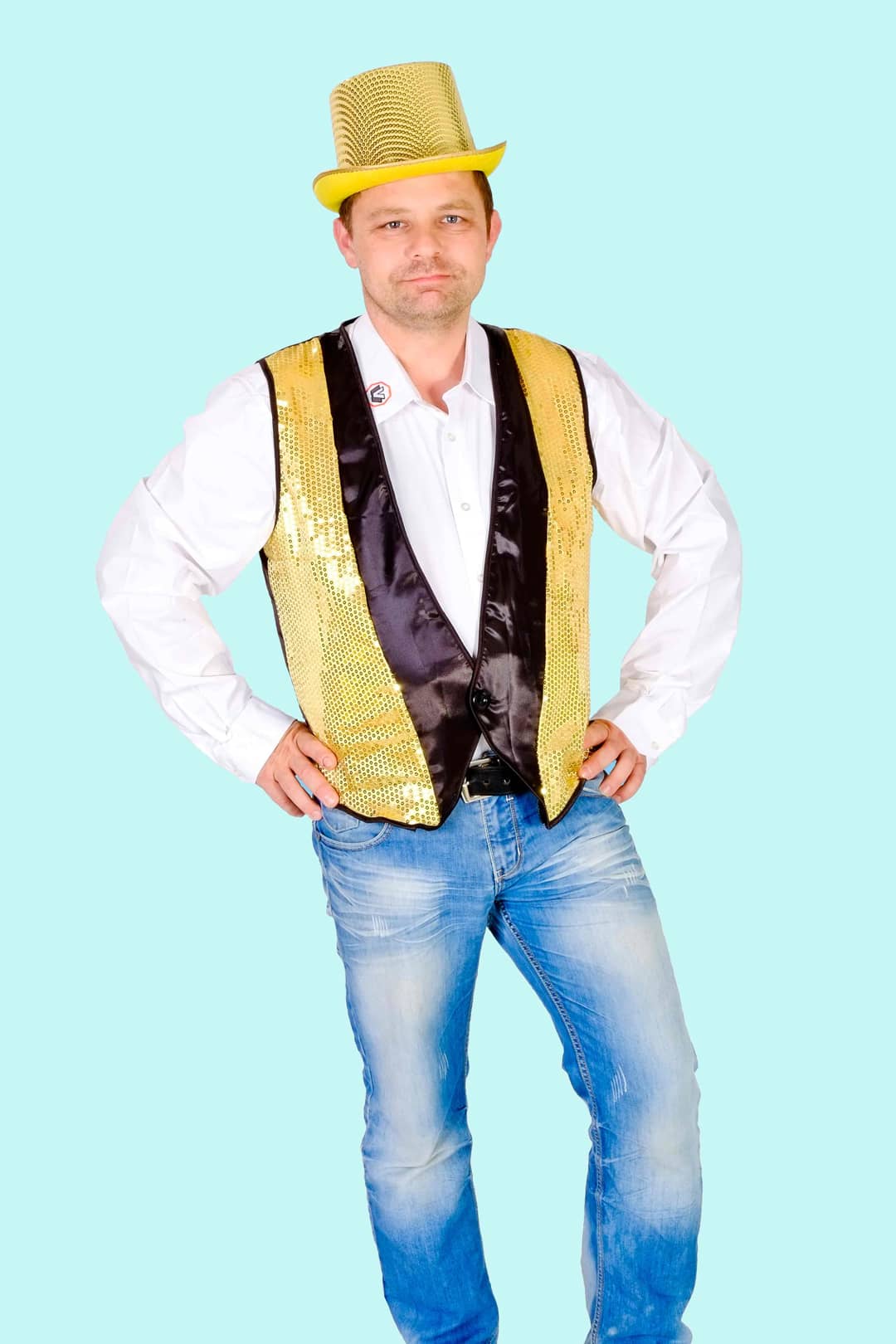 Kostüm goldene Disco Weste 70er Jahre Gr. XL für Erwachsene. 18,- € für vier Tage. Zubehör inklusive. Chemnitzer Kostümverleih F-66